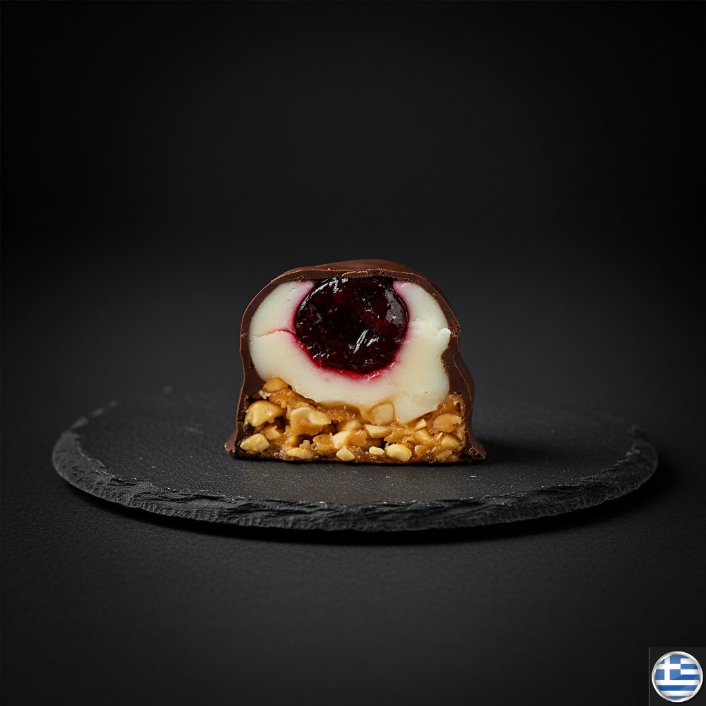 La bază găsești alune crocante care oferă un contrast delicios cu textura moale de deasupra. În mijloc, te așteaptă o combinație de cremă fină și gem gustos, care îți vor încânta papilele gustative. Totul este învelit într-un strat de ciocolată neagră, care se topește delicat în gură de la prima mușcătură, oferindu-ți o explozie de gusturi intense și rafinate.